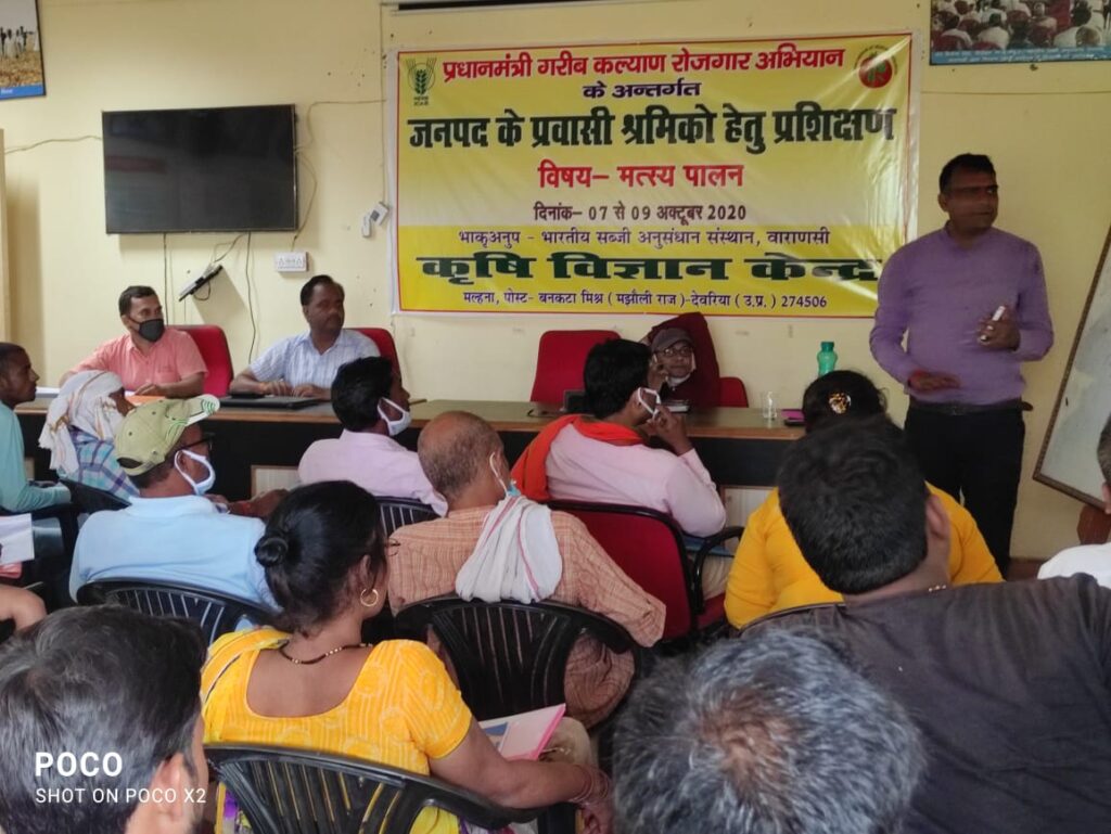 प्रशिक्षण कार्यक्रम के दौरान कृषि विज्ञान केंद्र के प्रभारी डॉक्टर संतोष चतुर्वेदी ने प्रशिक्षणार्थियों को मछली पालन के वैज्ञानिक जानकारी दी साथ में उन्होंने मछली पालन के आय-व्यय का ब्यौरा भी प्रस्तुत किया।