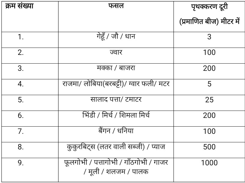 4- हर एक फसल की पृथक़्करण दूरी होती है जो इसके ही दूसरी प्रजाति के पौधे से अलग रखनी होती अन्यथा पास पास एक ही समय लगाने से 2 या ज्यादा किस्मो में मिलान हो जायेगा और लगी पहली किस्म शुद्ध न रह पायेगी।कुछ मुख्य फसलों में देशी बीजों की किस्मों में आपस की पृथक्करण दूरी इस प्रकार रखते हुए एक समय पर बुवाई करनी चाहिये, ध्यान रखें कि बीज उत्पादन व्यावसायिक रूप में करने वाले बड़े किसान इसकी आधार बीज की पृथक्करण दूरी प्रमाणित बीज वाली प्लॉट दूरी से दुगनी करके लगाये:–
