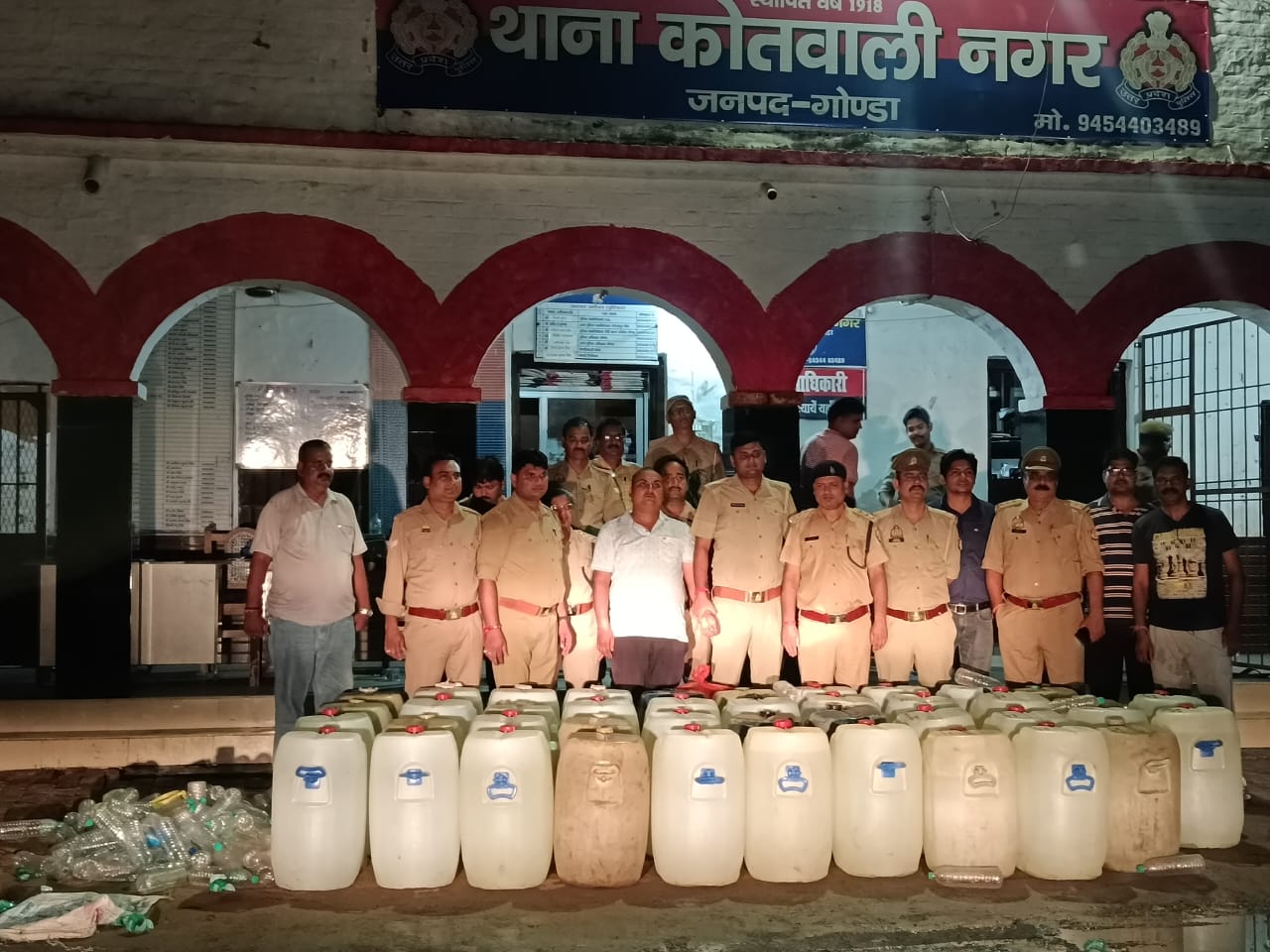 गोण्डा -आबकारी आयुक्त द्वारा दिए गए निर्देशों के क्रम में जिलाधिकारी के कुशल नेतृत्व में जनपद में अवैध शराब के विरुद्ध चलाए जा रहे प्रवर्तन अभियान के अंतर्गत मुखबिर की सूचना के आधार पर थाना कोतवाली नगर अंर्तगत गोंडा बहराइच रोड पर स्थित विभोर ग्राम में बने एक कमरे से 50 –50 लीटर की 43 गैलन से कुल 2125 लीटर एथेनॉल बरामद किया गया।