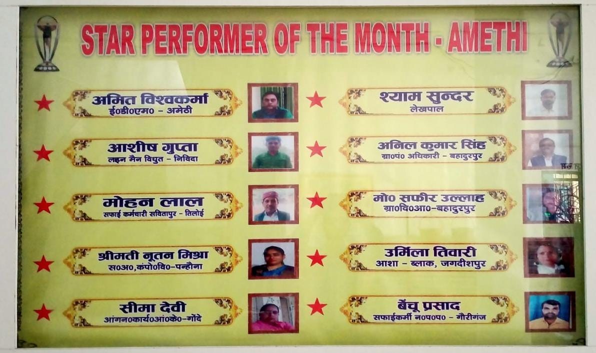 अमेठी। जनपद में कार्यरत कर्मचारियों को प्रोत्साहित करने के उद्देश्य से जिलाधिकारी निशा अनंत के निर्देशन में एवं मुख्य विकास अधिकारी सूरज पटेल के मार्गदर्शन में स्टार परफॉर्मर ऑफ द मंथ कार्यक्रम का शुभारंभ किया गया है। इस कार्यक्रम के अंतर्गत जनपद में  उत्कृष्ट कार्य करने वाले कर्मचारियों को चिन्हित कर उनकी फोटो नाम सहित कलेक्ट्रेट में लगाई जाएगी। इसका उद्देश्य जनपद के अधिकारियों एवं कर्मचारियों को अपने-अपने कार्यों एवं दायित्वों के प्रति प्रोत्साहित करना एवं उत्कृष्ट कार्य करने वाले कर्मचारियों को सम्मानित करना है।