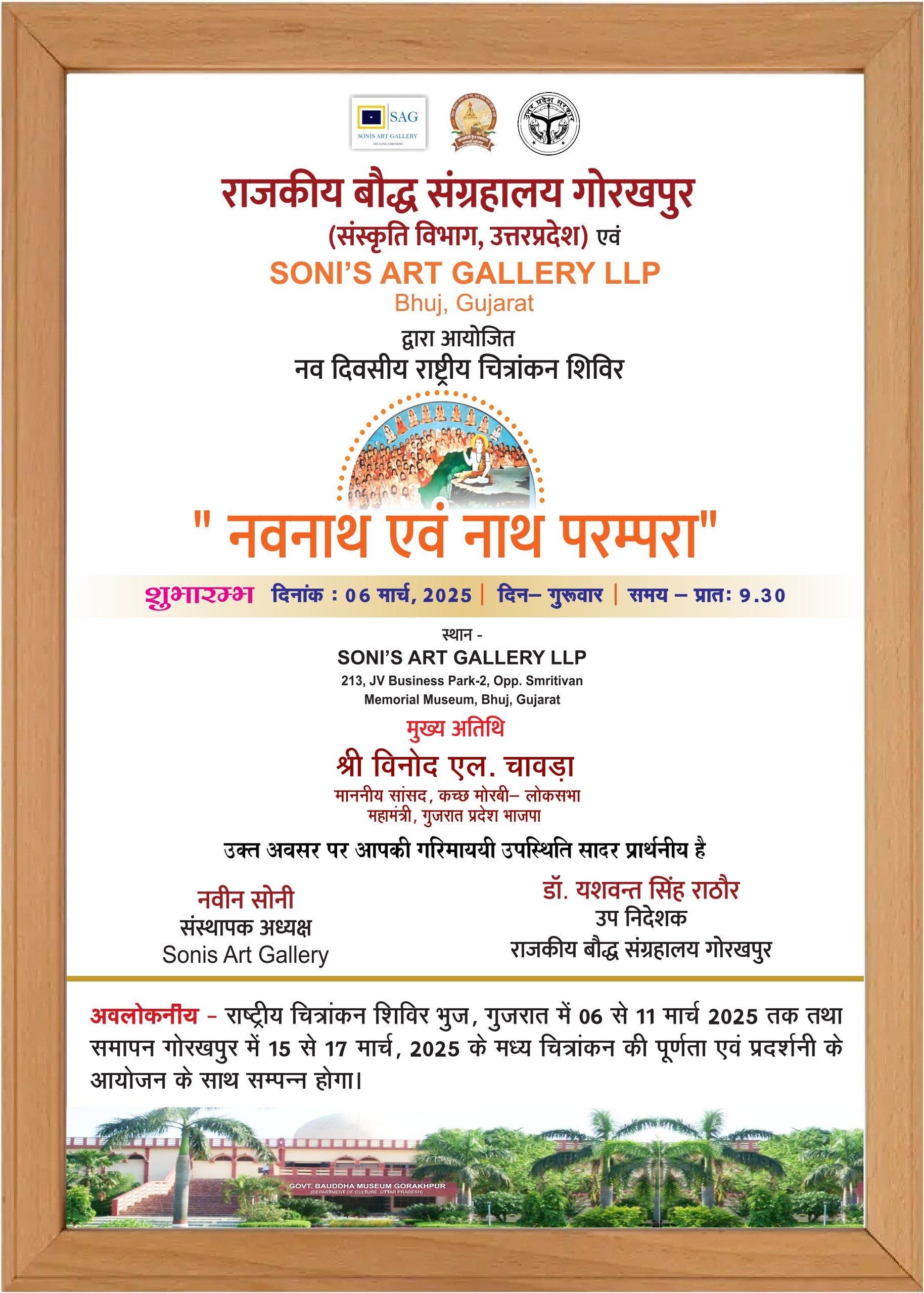 गोरखपुर-नव दिवसीय राष्ट्रीय चित्रांकन शिविर का उद्घाटन भुज में और पूर्णता प्रदर्शनी आयोजन के साथ उत्तर प्रदेश संस्कृति विभाग के राजकीय बौद्ध संग्रहालय गोरखपुर में होगी। भुज स्थित सोनिस आर्ट गैलरी नवीन सोनी कच्छ और राजकीय बौद्ध संग्रहालय गोरखपुर के संयुक्त उपक्रम से यह राष्ट्रीय चित्रांकन शिविर का आयोजन किया गया है। जिसमें नवनाथ एवं नाथ परम्परा के विषय पर नवीनतम रचनात्मक सृजन किया जाएगा।