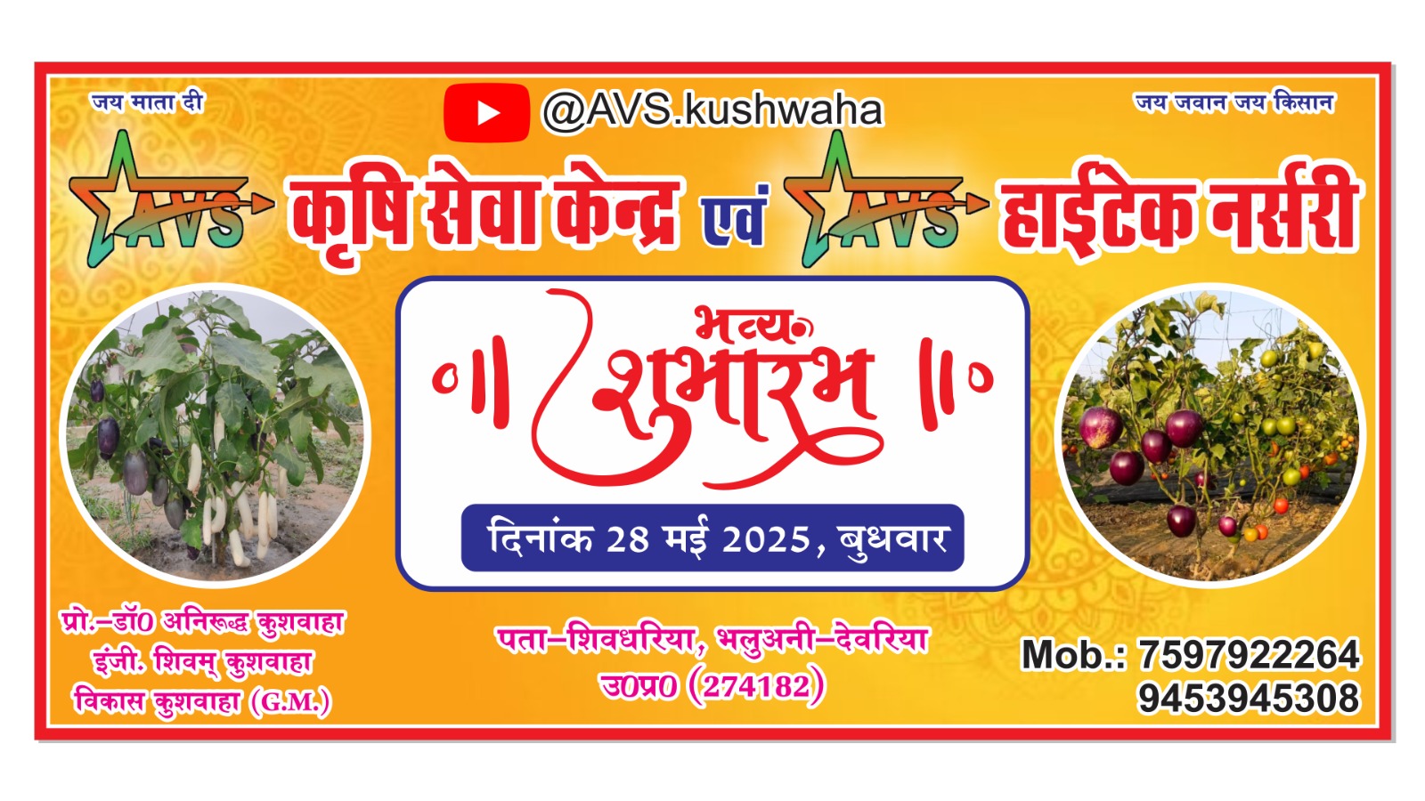 देवरिया -ऑर्गेनिक सब्जी फल और सब्जियों को बढ़ावा देने के लिए AVS कृषि सेवा केंद्र और AVS हाईटेक नर्सरी का 28 मई 2025 को भव्य उद्घाटन समारोह का आयोजन किया जा रहा है। जिसमे देवरिया जिला के सभी कृषि एवं उद्यान विभाग के अधिकारी ,कर्मचारी मौजूद रहेंगे | उक्त जानकारी शिवम कुशवाहा ने दिया |