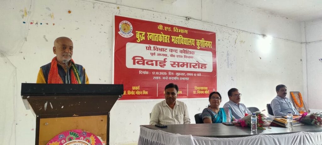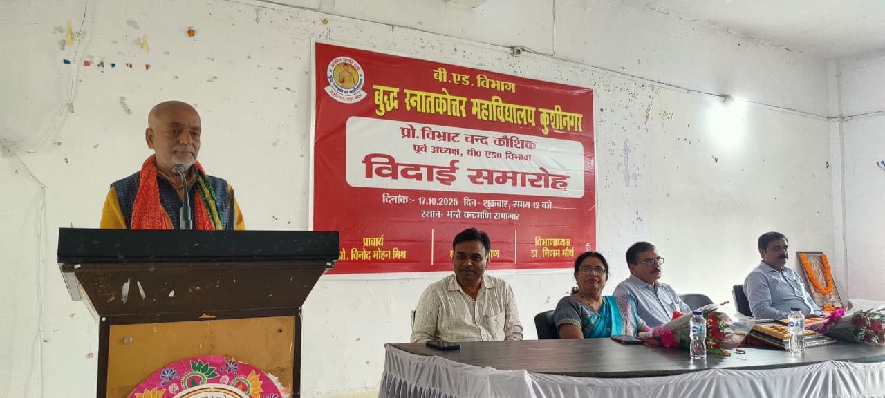 कुशीनगर-शिक्षक का पहला कार्य विभिन्न प्रकार के सामाजिक राग द्वेष से मुक्त होकर विद्यार्थियों को ज्ञान देना है। अपने राष्ट्र, समाज और अधिकारों के लिए उनकी मनः स्थिति का निर्माण शिक्षण के प्रमुख आयाम हैं। उक्त बातें बी एड विभाग के अवकाश प्राप्त विभागाध्यक्ष आचार्य प्रोफेसर विभ्राट चंद कौशिक ने कही। वे बुद्ध स्नातकोत्तर महाविद्यालय में बीएड विभाग द्वारा आयोजित विदाई समारोह में बोल रहे थे।
