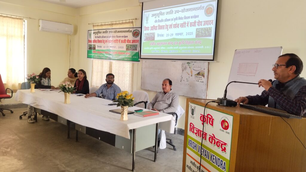 कुशीनगर-स्थानीय किसानों को लाभदायक कृषि उद्यम स्थापित करने हेतु ज्ञान और तकनीकों से सशक्त बनाने के उद्देश्य से नर्सरी प्रबंधन पर पाँच दिवसीय कौशल विकास कार्यक्रम, कृषि विज्ञान केंद्र (केवीके), कुशीनगर में सफलतापूर्वक उद्घाटन हुआ। इस पहल के तहत धुरिया हाता, जमुआन, मंझरिया के किसानो के 25 महत्वाकांक्षी किसानों, जिनमें महिलाएँ भी शामिल थीं, को व्यावहारिक प्रशिक्षण दिया गया।ICAR-IIVR, RRS, सरगटिया के मार्गदर्शन में केवीके, कुशीनगर द्वारा आयोजित इस कार्यक्रम में गुणवत्तापूर्ण रोपण सामग्री की बढ़ती मांग और स्थायी आय स्रोत के रूप में नर्सरी उत्पादन की संभावना पर चर्चा की गई।
