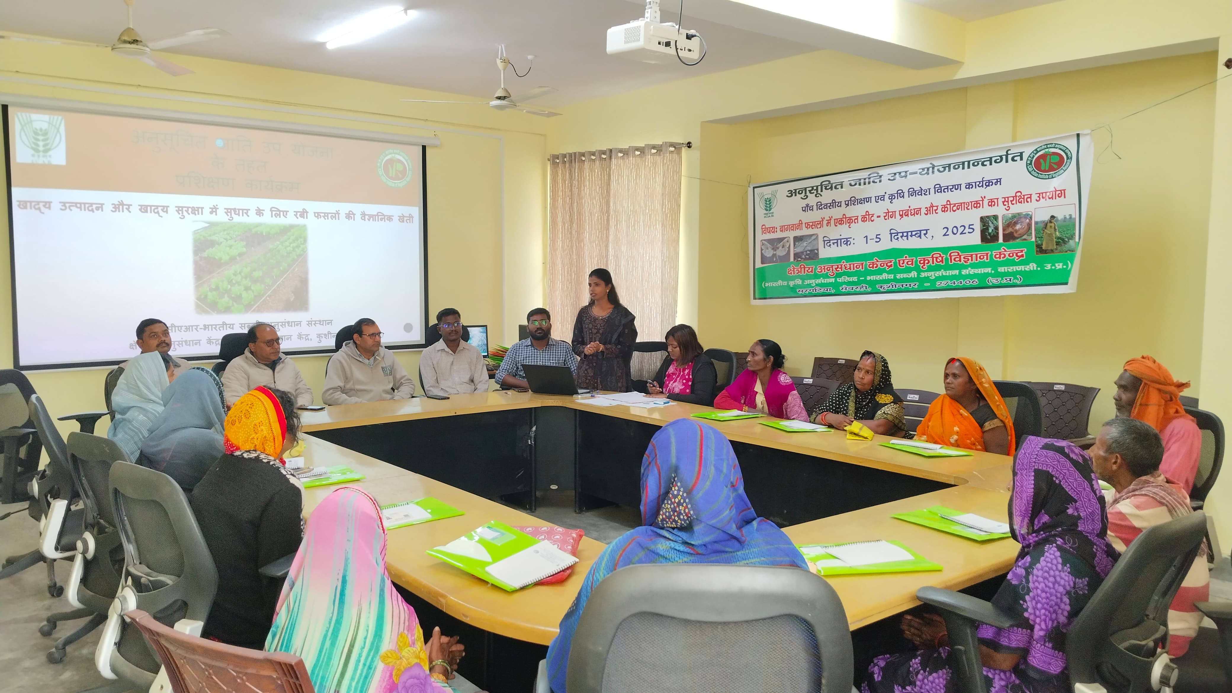 कुशीनगर -क्षेत्रीय अनुसंधान केंद्र और कृषि विज्ञान केंद्र, कुशीनगर में एससी के अंतर्गत अनुसूचित जाति उपयोजना के तहत किसानों को सब्जी की खेती में कीट और रोग प्रबंधन एवं सुरक्षित उपयोग कीटनाशकों के विषय पर 25 सब्जी के किसानों को 5- दिवसीय प्रशिक्षण दिया गया।प्रशिक्षण के समन्वयक पादप रोग विशेषज्ञ डाॅ. गंगाराज आर ने किसानों को रबी की फसलों में रोग प्रबंधन की समस्या के समाधान बताएं।