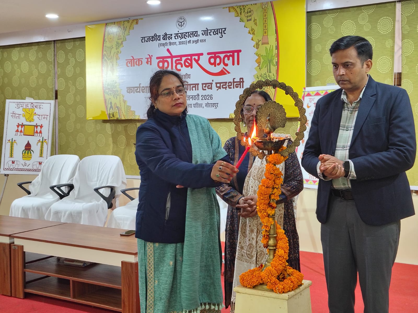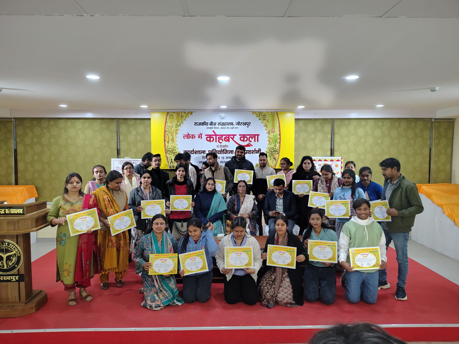 गोरखपुरः-राजकीय बौद्ध संग्रहालय, गोरखपुर द्वारा लोक कलाओं के संरक्षण एवं संवर्धन के उद्देश्य से आयोजित दो दिवसीय ’’लोक में कोहबर कला” कार्यशाला का समापन समारोह रविवार को प्रमाण-पत्र वितरण एवं प्रदर्शनी आयोजन के साथ सम्पन्न हुआ।
