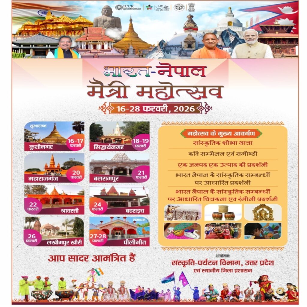 लखनऊ:भारत-नेपाल मैत्री महोत्सव 2026 का आयोजन 16 से 28 फरवरी 2026 तक उत्तर प्रदेश के 8 जिलों में किया जाएगा। इस खास महोत्सव की शुरुआत 16-17 फरवरी को कुशीनगर से होगी, इसके बाद 18-19 फरवरी को सिद्धार्थनगर में कार्यक्रम आयोजित होंगे। आगे महाराजगंज, बलरामपुर, श्रावस्ती, बहराइच, लखीमपुर खीरी और 27-28 फरवरी को पीलीभीत में अलग-अलग सांस्कृतिक आयोजन होंगे। यह महोत्सव भारत और नेपाल के बीच ऐतिहासिक और सांस्कृतिक रिश्तों को और मजबूत बनाने का एक बड़ा प्रयास है।पूर्वांचल और तराई के 8 जिलों में होंगे आयोजन-