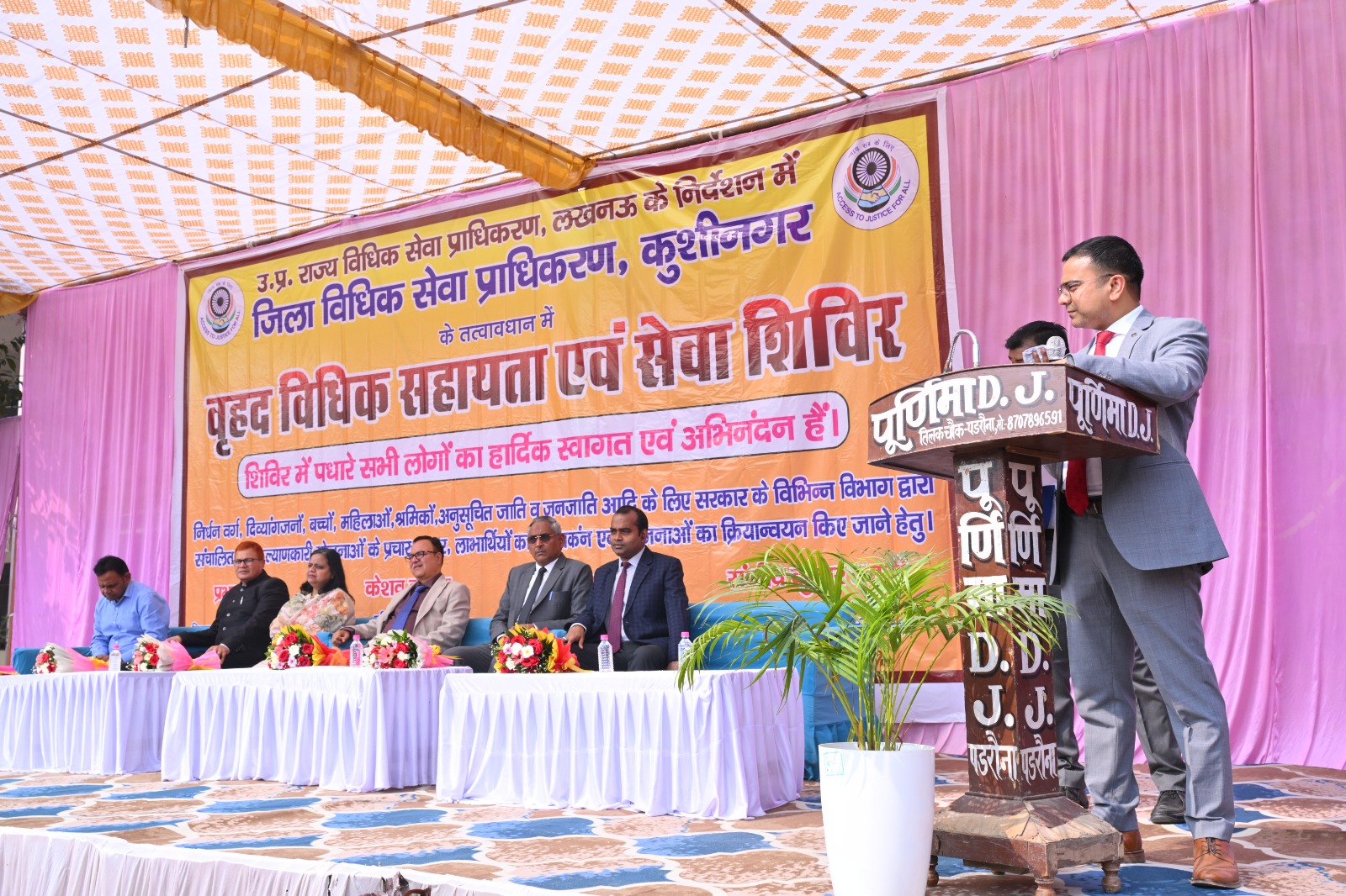 कुशीनगर- प्रभात सिंह, सचिव, जिला विधिक सेवा प्राधिकरण, कुशीनगर द्वारा बताया गया कि राष्ट्रीय विधिक सेवा प्राधिकरण, नई दिल्ली व राज्य विधिक सेवा प्राधिकरण, लखनऊ के निर्देशानुसार जिला विधिक सेवा प्राधिकरण, कुशीनगर के तत्वाधान में मेगा/वृहद विधिक सहायता एवं सेवा शिविर का आयोजन जनपद न्यायालय परिसर में 22-02-2026 को किया गया, जिसका शुभारम्भ संजीव कुमार त्यागी, जनपद न्यायाधीश/अध्यक्ष जिला विधिक सेवा प्राधिकरण, इफराक अहमद, अपर जिला एवं सत्र न्यायाधीश, वंदिता श्रीवास्तव मुख्य विकास अधिकारी, विजय कुमार वर्मा-II, मुख्य न्यायिक मजिस्ट्रेट, प्रेम कुमार राय, अपर जिलाधिकारी, चन्द्र प्रकाश, मुख्य चिकित्साधिकारी, सिद्वार्थ वर्मा, अपर पुलिस अधीक्षक के द्वारा संयुक्त रूप से दीप प्रज्जवलित कर एवं माँ सरस्वती की प्रतिमा पर माल्यार्पण कर किया गया।